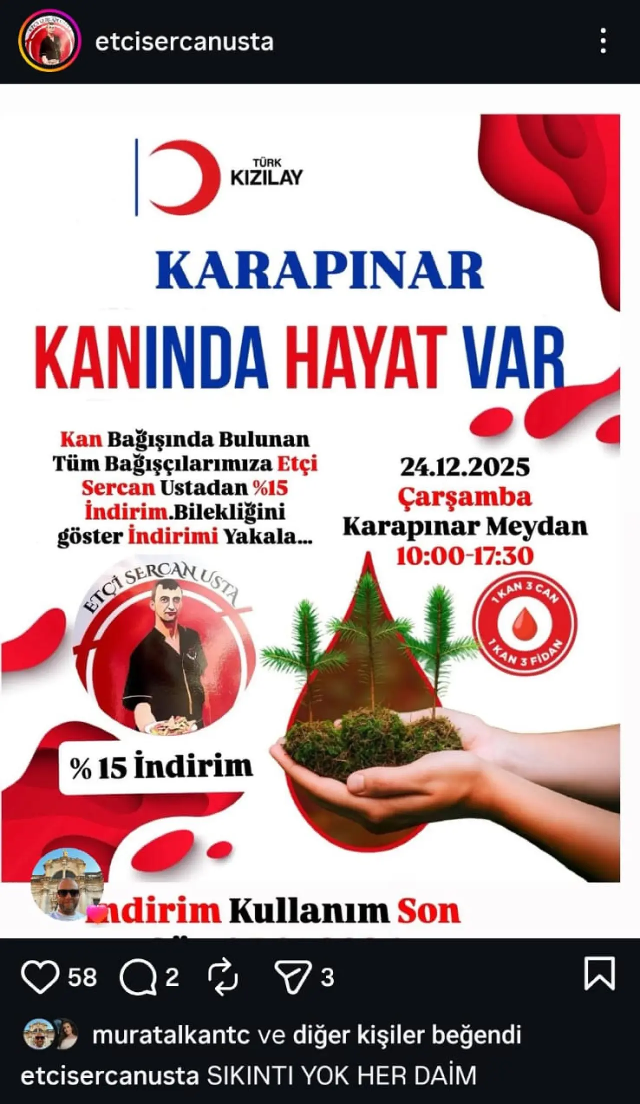 Etçi Sercan Usta, kan bağışında bulunarak Kızılay bilekliği alan tüm vatandaşlara yüzde 15 indirim uygulanacağını duyurdu. Bağışçılar, bilekliklerini göstererek indirimden yararlanabilecek.