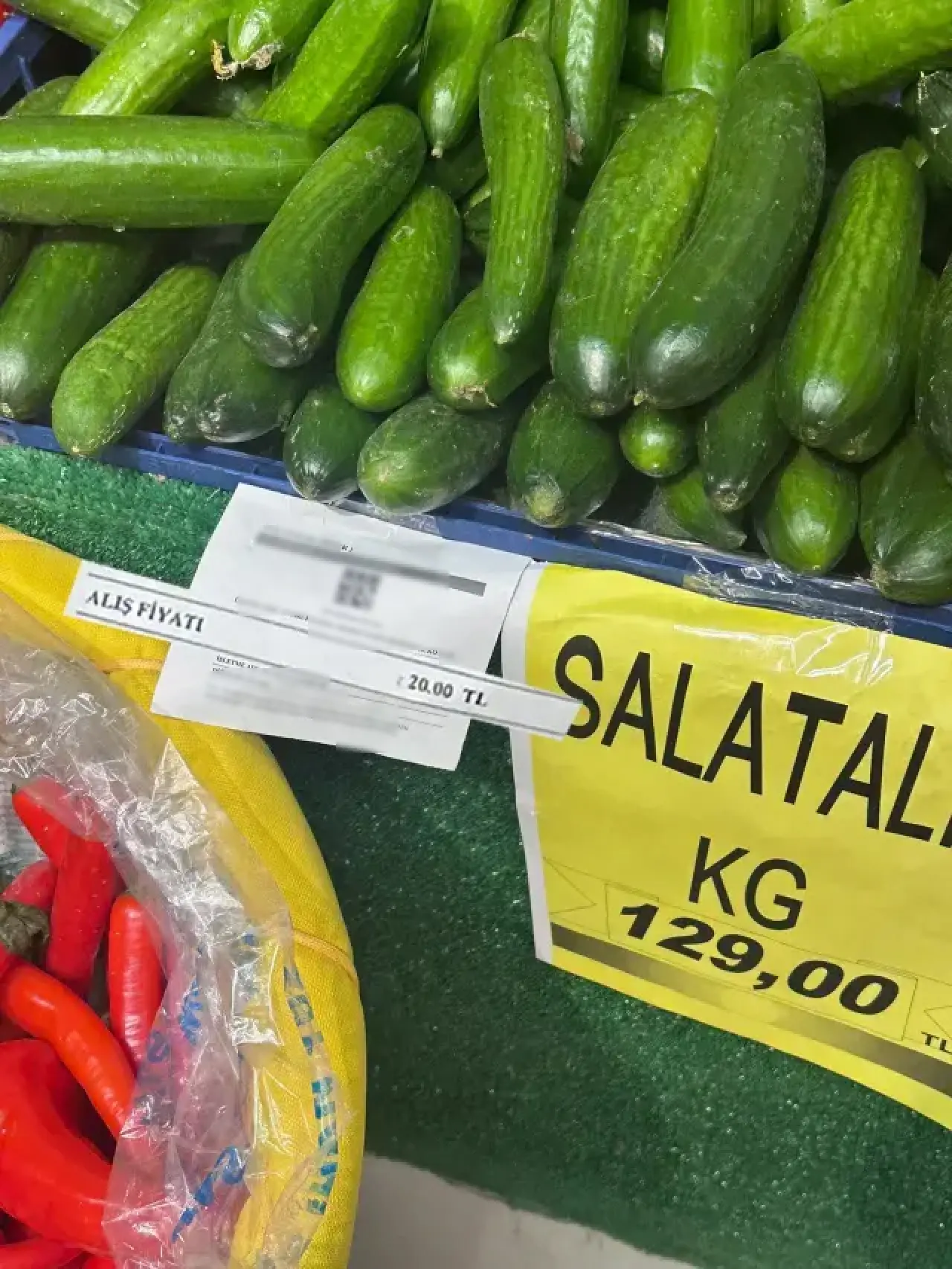 Üreticiden 20 TL'ye alındığı belirtilen salatalık, zincir markette 129 TL'ye satışa sunuldu; yaklaşık 5,5 katlık fiyat farkı tartışma yarattı.