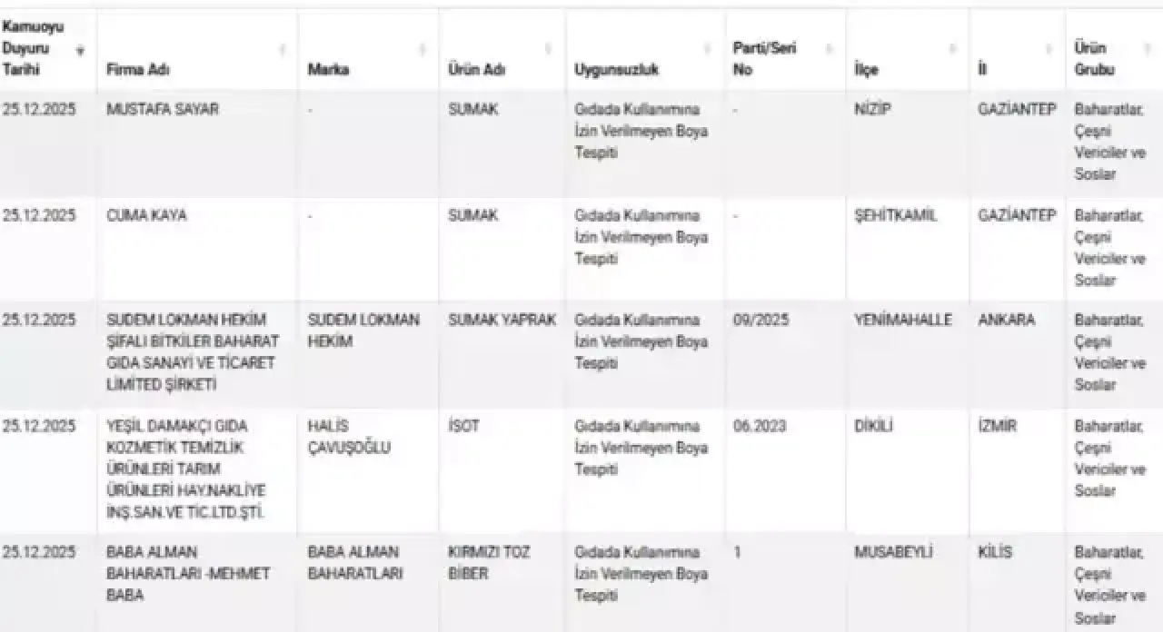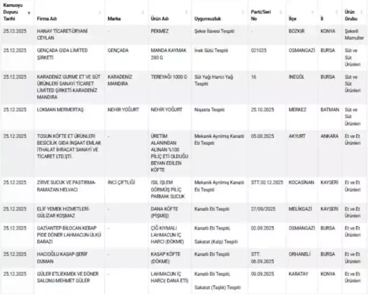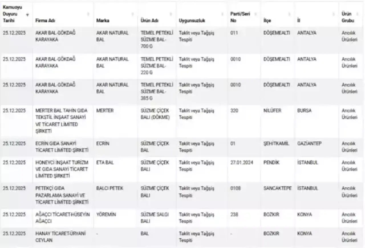 Tarım ve Orman Bakanlığı, gerçekleştirdiği denetimler sonucu hazırlanan yeni taklit–tağşiş listesini yayımladı. Listede baharat, bal, süt ve süt ürünleri gibi birçok üründe mevzuata aykırı uygulamalar tespit edildi.