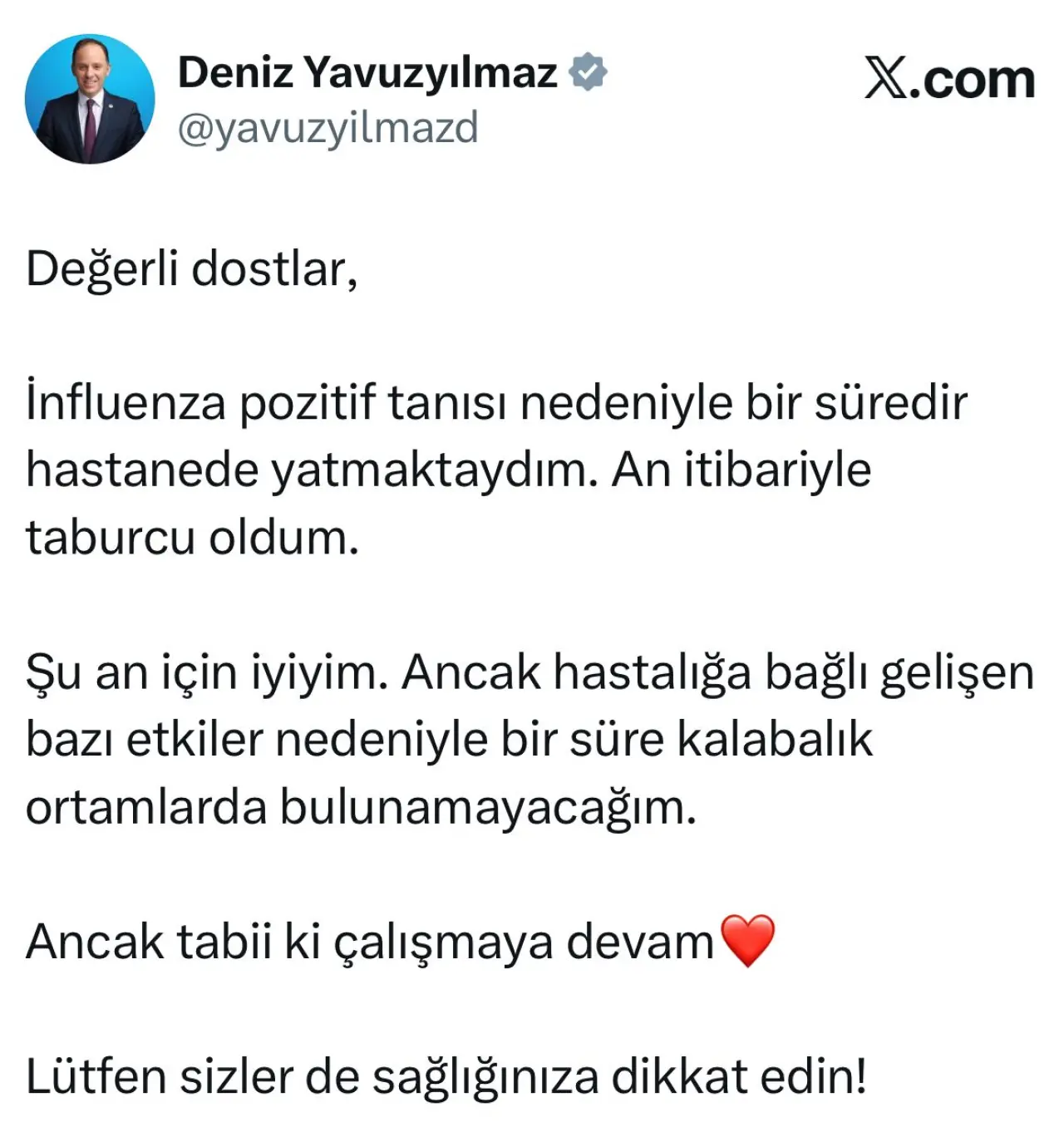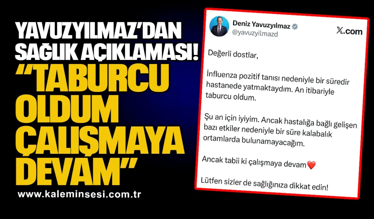 Sosyal medya X hesabından bir açıklama yapan Yavuzyılmaz, influenza pozitif tanısı nedeniyle bir süre hastanede yattığını belirterek, sağlık durumunun şu an iyi olduğunu ifade etti.
