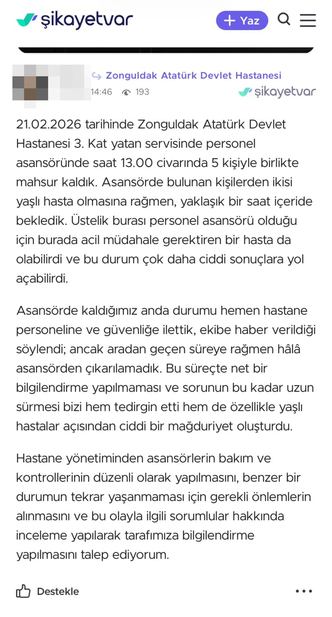 21 Şubat 2026 tarihinde, saat 13.00 civarında yaşanan olayda, asansörün hareket edememesi nedeniyle içerideki vatandaşlar yaklaşık bir saat boyunca mahsur kaldı. Olayı yaşayan Berna isimli vatandaş, durumu hemen hastane personeline ve güvenliğe bildirdiklerini, ancak müdahalenin oldukça yavaş kaldığını ifade etti. İçerideki yaşlı hastalar için hayati tehlike oluşturabilecek bu uzun süreli bekleyiş, hastalar ve yakınları için büyük bir mağduriyet ve endişe kaynağı oldu.