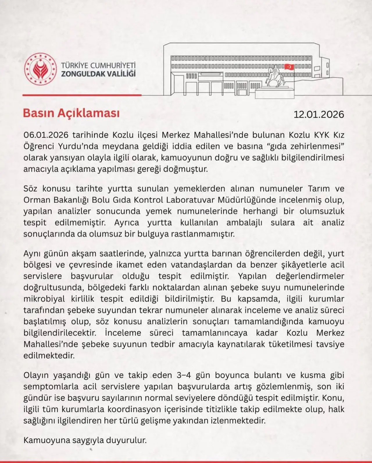 Kozlu KYK Kız Öğrenci Yurdu'nda 6 Ocak tarihinde yaşanan ve çok sayıda öğrencinin mide bulantısı şikayetiyle hastaneye kaldırıldığı olayla ilgili Zonguldak Valiliği son noktayı koydu. Tarım ve Orman Bakanlığı Bolu Gıda Kontrol Laboratuvarı’nda incelenen yemek ve ambalajlı su numunelerinde herhangi bir olumsuzluğa rastlanmadı.