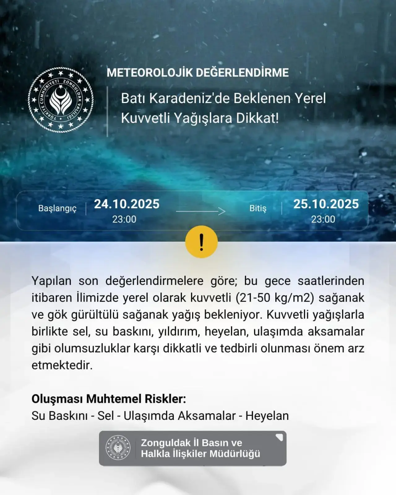 Meteoroloji ve Zonguldak Valiliği, kent genelinde etkili olması beklenen kuvvetli yağışlara karşı vatandaşları uyardı. Yetkililer, yağış miktarının yer yer 21 ila 50 kilogram arasında olabileceğini belirterek, sel, su baskını, yıldırım, heyelan ve ulaşımda aksamalar gibi olumsuzluklara karşı dikkatli olunması gerektiğini ifade etti.